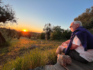 There was still a bit of garden cleaning up to do when we returned to the Adega, and when we finished we took our drinks to the olive grove down the lane. John recorded the sounds of the birds in the grove on his nifty app which told him each bird's name and sitting on a platform Wil built last summer, we watched the sun set. Well he tried to but we were talking and messing up his recordings. Apparently there is a vast number of species that visit the property, including a nightingale and a woodpecker.