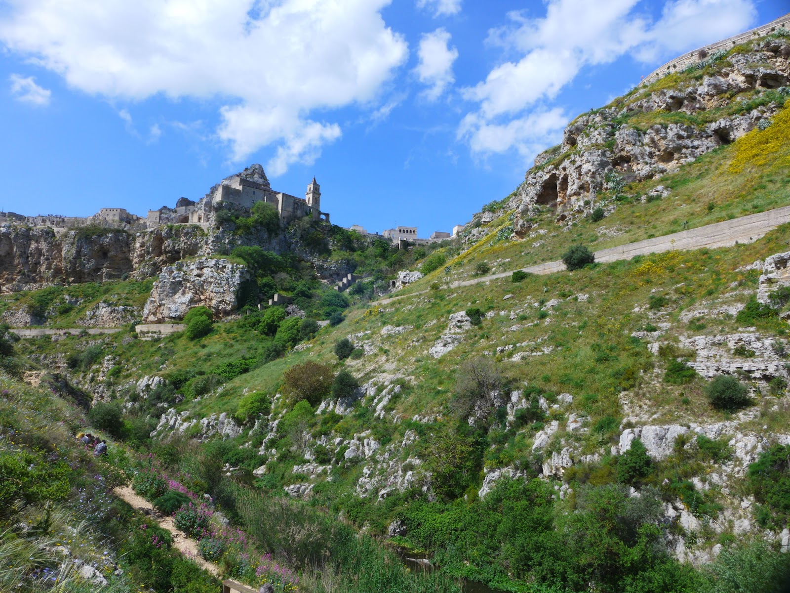 We were soon strolling down the road towards Sassi Caveoso. In the morning light we could see more of the dwellings that had been carved into the rock walls on the other side of the valley. We followed the dropping path that wound its way between the houses until we reached a massive eruption of rock. Tht was our destination. A narrow path clung to the side of the mountain, giving us some excellent views down the valley and the little scribble of a river that over the centuries had carved its way into a valley and then a ravine. Perched up on the top of the rocky outcrop was a cave church topped with a wild looking spiked cross. With some slow, careful footwork I was able to make it up to the level at the foot of the church.